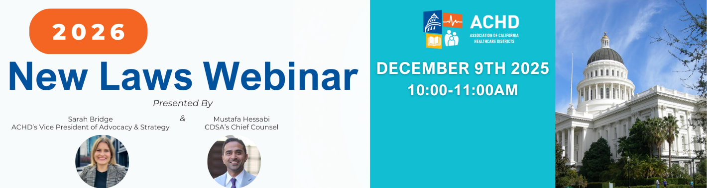 Originally recorded on 12/9/2025. During this webinar, Sarah Bridge, Vice President of Advocacy & Strategy for ACHD & Mustafa Hessabi, Chief Counsel for CSDA. Sarah and Mustafa will provide an update on new bills signed into law that become effective January 1, 2026. Sarah will also provide insights on ballot initiative activity and the political landscape in Sacramento.
